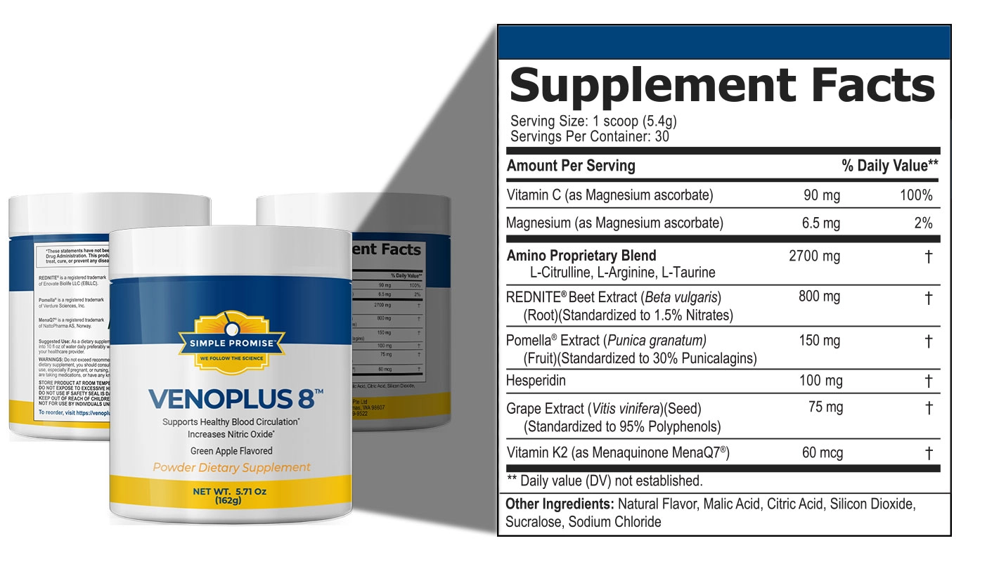 VenoPlus 8 is a powdered dietary supplement designed to improve blood circulation, enhance nitric oxide levels, and support cardiovascular health.